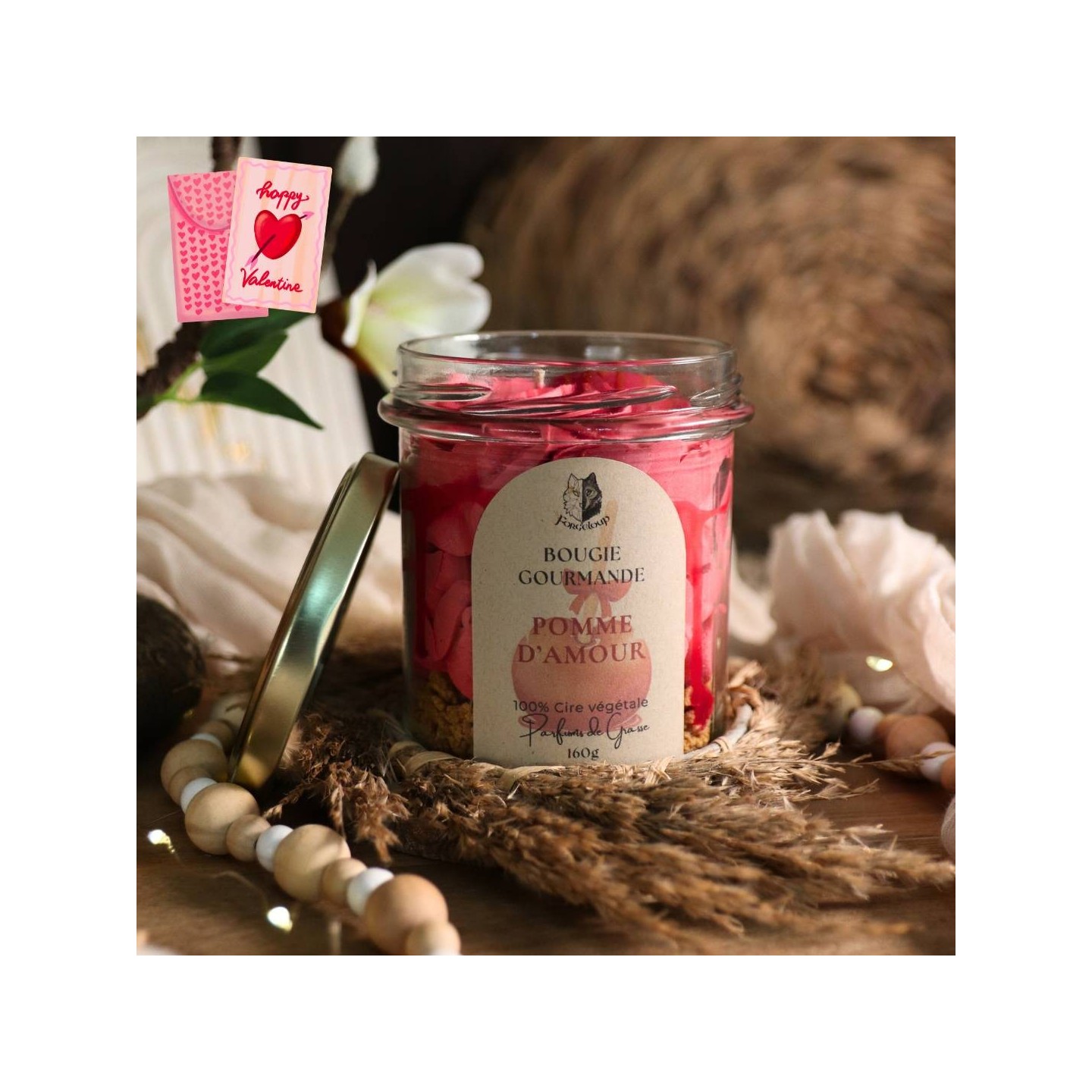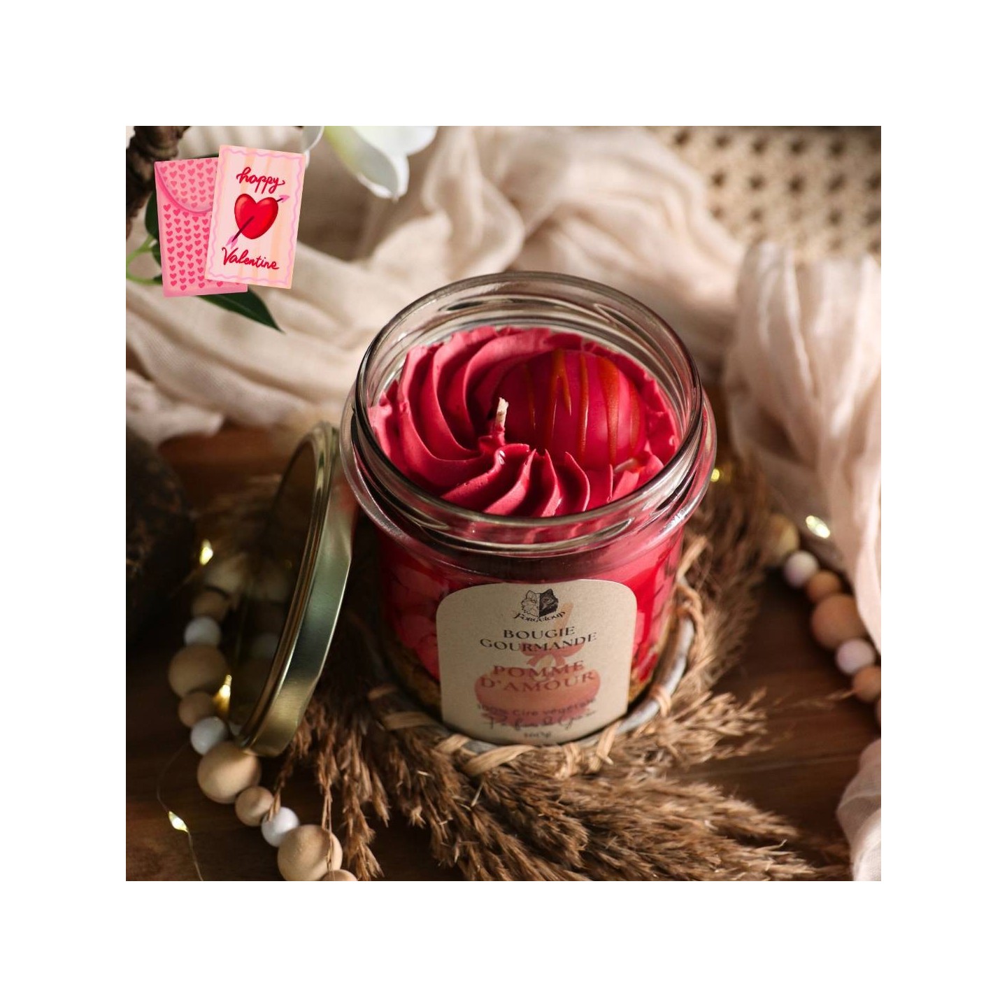 Une superbe bougie, au parfum Pomme d'amour ! Idéal pour déclarer votre amour ou se cocooner soi-même !
